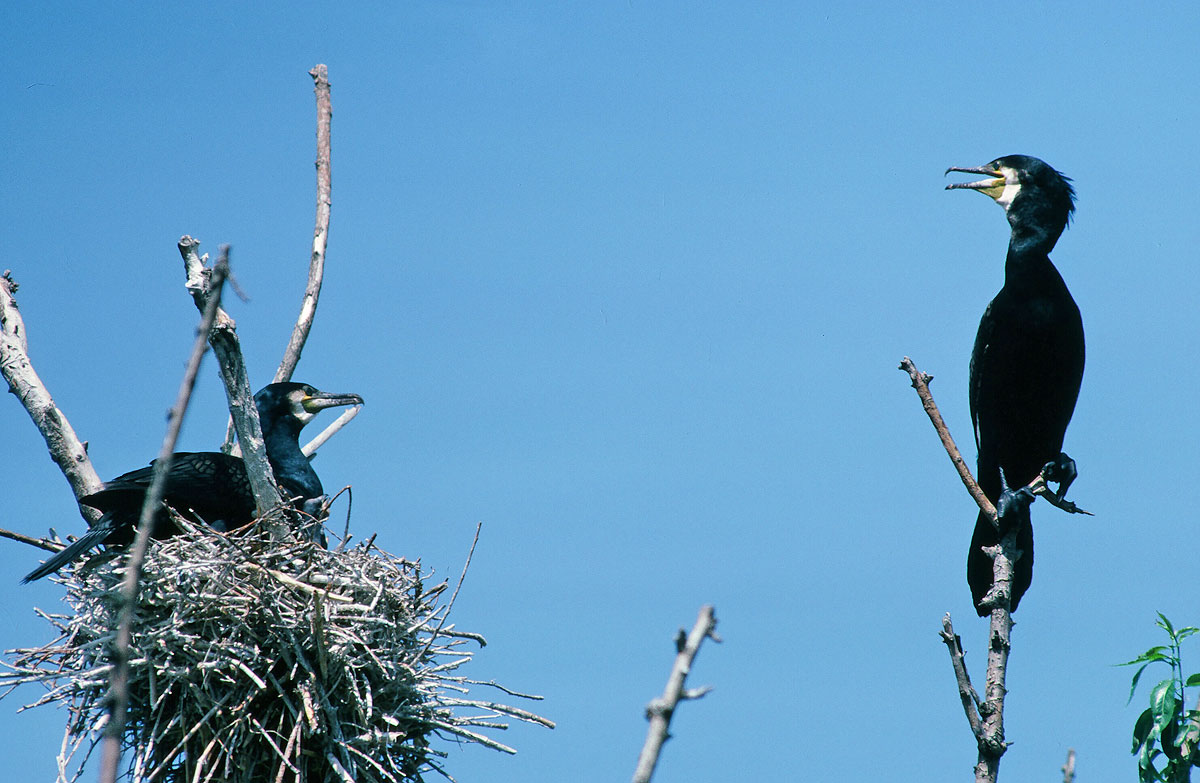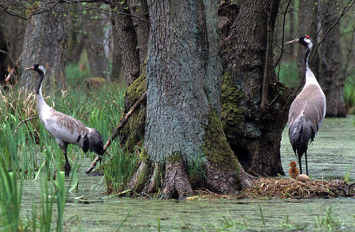 Graukranichpaar am Nest in einem norddeutschen Erlenbruch